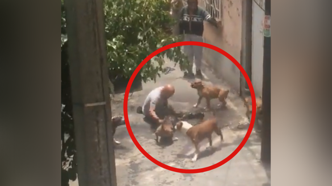 En el breve clip se pueden ver a los caninos atacando a otro perro, mientras un hombre intenta quitárselo de encima sin tener éxito, pues entre todos los animales lo atacan a él y al otro can.