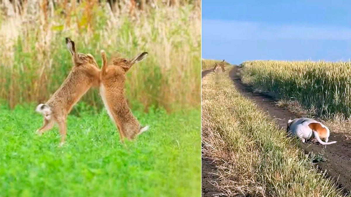 Dos liebres boxean vigiladas de cerca por un perro de presa – Club de Caza